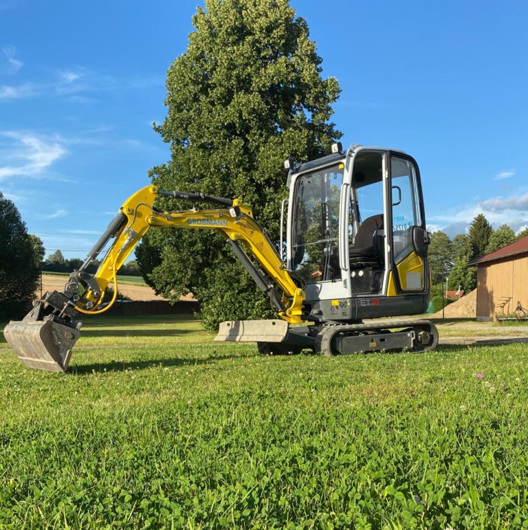 Bagger ist mit einem Mobilen Schnellwechsler und verstell Ausleger ausgerüstet.